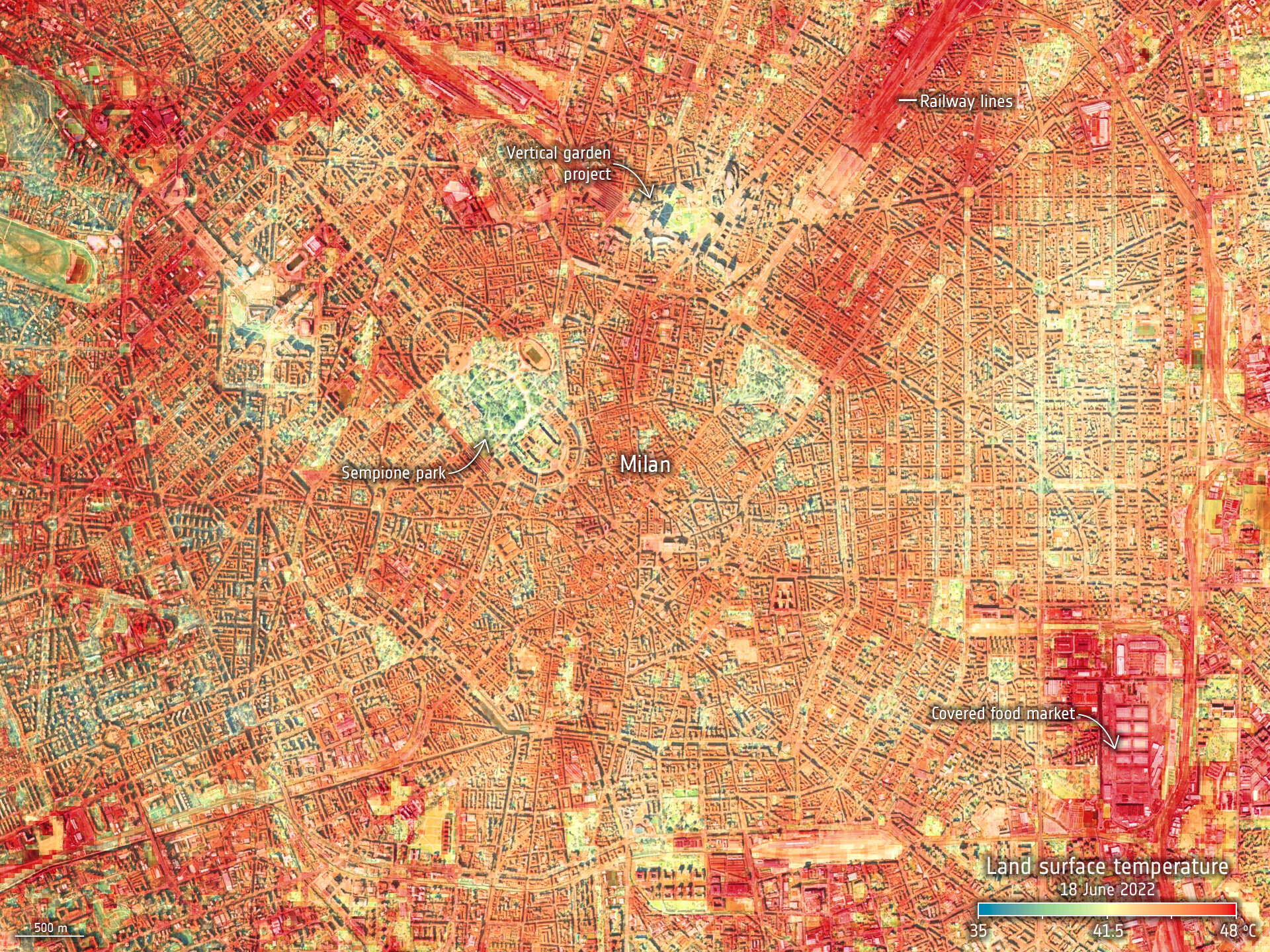 Lo strumento di misura della temperatura ECOSTRESS, installato sulla Stazione Spaziale Internazionale, ha catturato le recenti temperature estreme della superficie terrestre per alcune città europee, tra cui Milano.